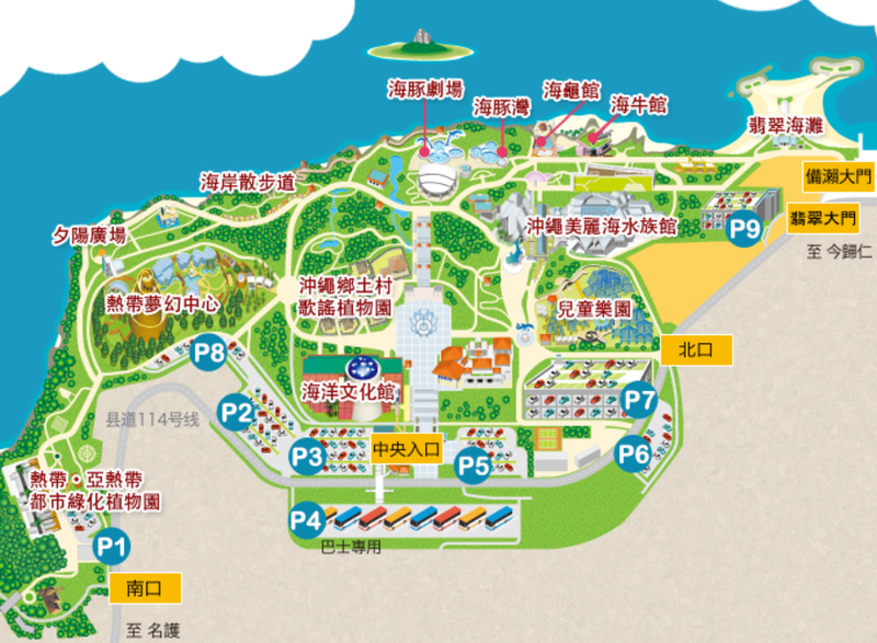 美麗海水族館位於 海洋博公園 內,園區腹地非常大,設有多個免費停車場,開車前往相當方便。